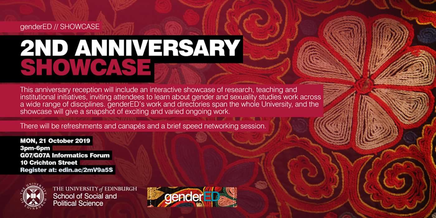 Director Fiona Mackay reflects on the highlights of 2019-20 for GENDER.ED – the University of Edinburgh’s interdisciplinary hub for showcasing gender and sexualities studies. GENDER.ED is hosted by IASH (Institute for Advanced Studies in the Humanities) on behalf of the College of Arts, Humanities and Social Sciences (CAHSS), supported by Edinburgh University Students Association (EUSA), and powered by the School of Social and Political Science (SPS).