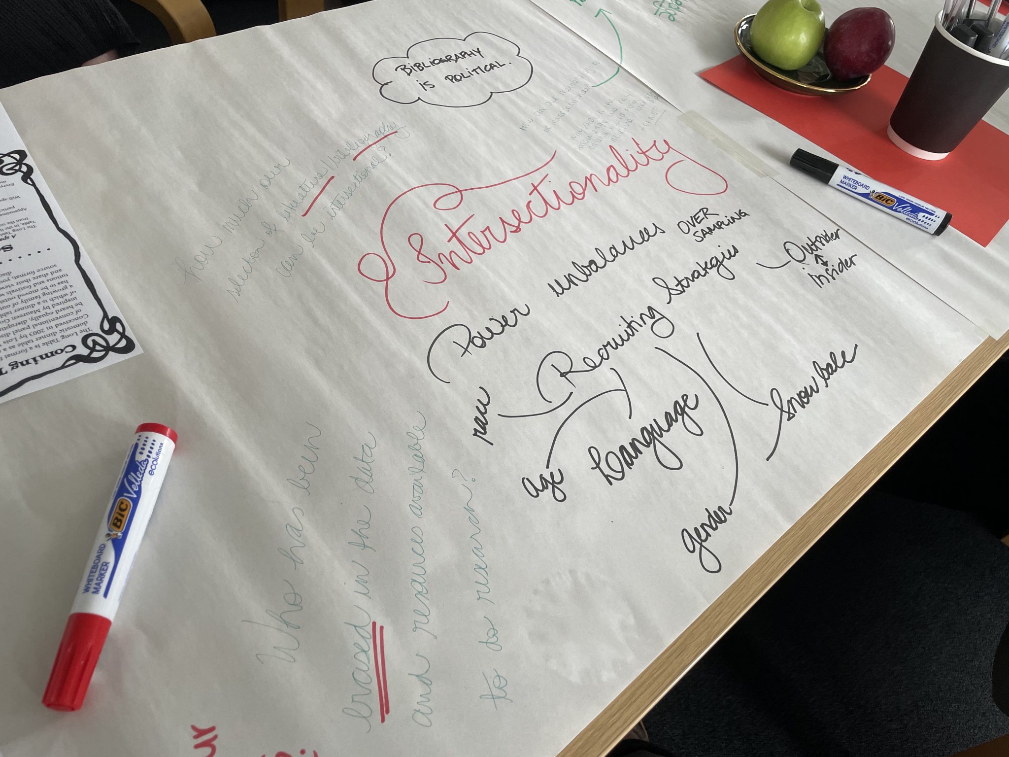 This ‘long table’ discussion embodied the possibility of troubling hierarchical ideas of ‘centre and margin’, ‘authoritative researcher’ and ‘objectified subject’, and offered an un-mediated collaborative safe-space for intersectional dialogue.